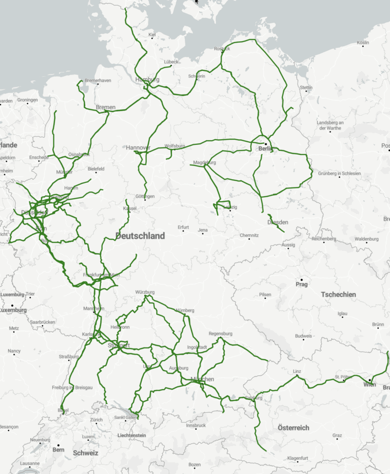 Unser Streckennetz umfasst über 16.000 km in Deutschland und bietet Ihnen eine umfangreiche Auswahl an digitalisierten Strecken. Zusätzlich stehen vereinzelte Strecken in Österreich, Niederlande und Dänemark zur Verfügung. Alle Strecken werden nach den höchsten Standards und gemäß VDV 755 digitalisiert. Dank optimierter Prozesse garantieren wir Ihnen höchste Qualität und Effizienz.